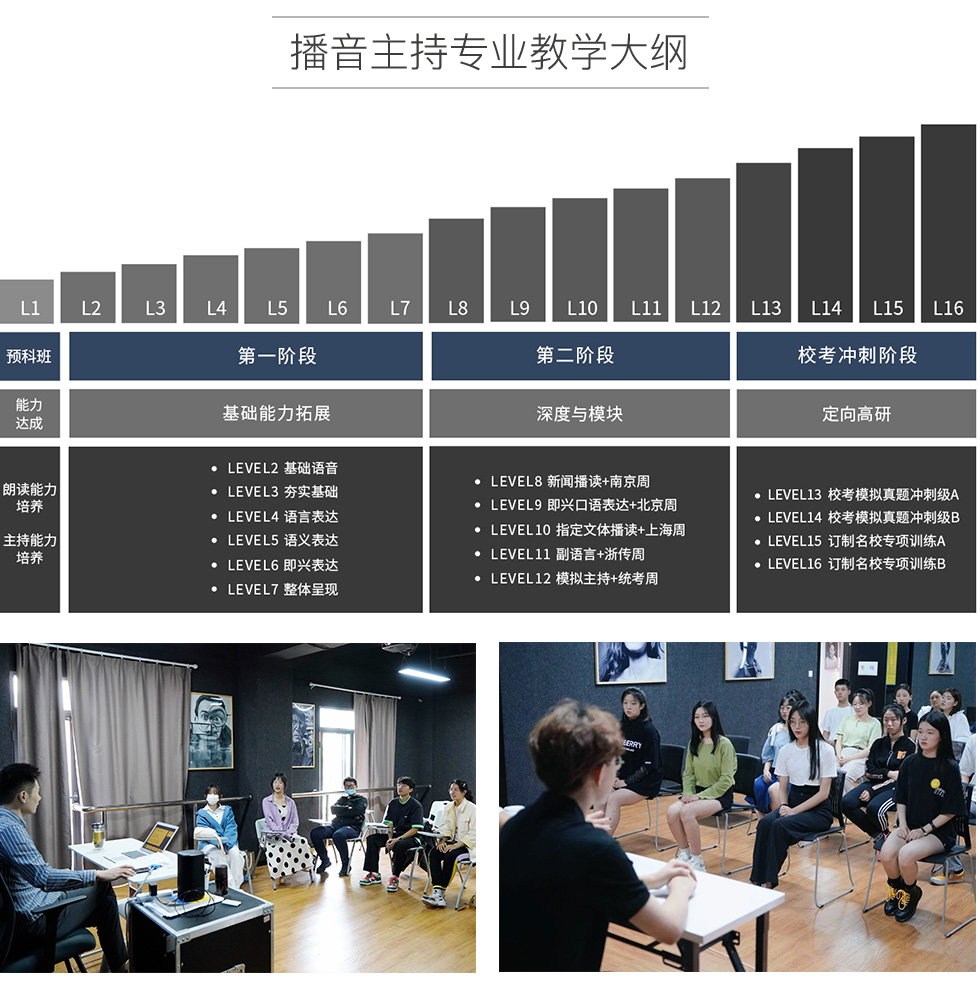 定制化課程是印象獨家制勝法寶!上海印象播音專業實習小班教學,每班限招 15 人,導師對學員從學習研討、家長反饋、擇校指導、錄制帶考全程負責。以大課+小課模式,輔以聲樂、形體、表演等課程提高學生綜合素養,同時以每周小考兩周大考的模擬測評方式提高學生應試能力。